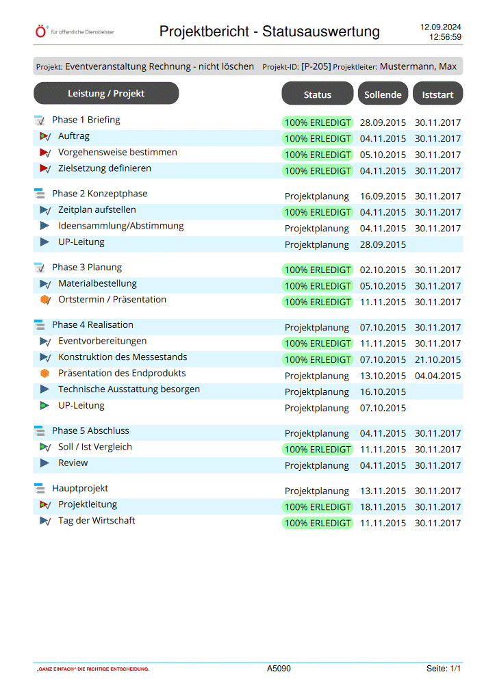 Projektbericht-Statusauswertung (A5090) Der Bericht Projektbericht - Statusauswertung (A5090) zeigt eine Auflistung aller Leistungen, Unterprojekte und Hauptprojekte eines Projekts mit deren Status, Sollende und Iststart. Jedes Projekt ist unterteilt in Hauptprojekte, Unterprojekte und Leistungen. Zu jedem Element sind folgende Werte angegeben: