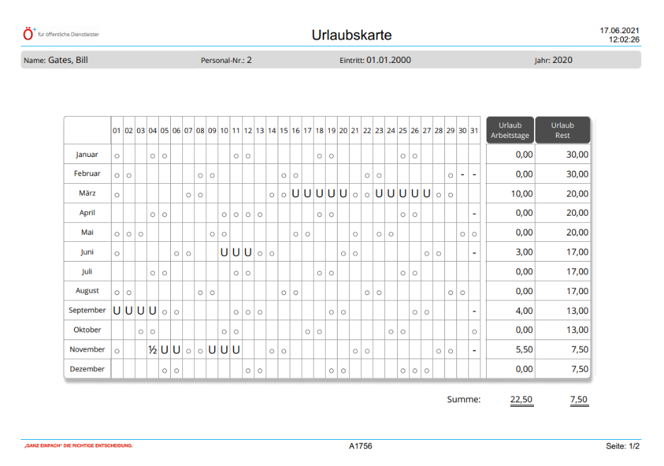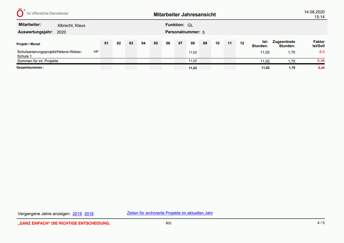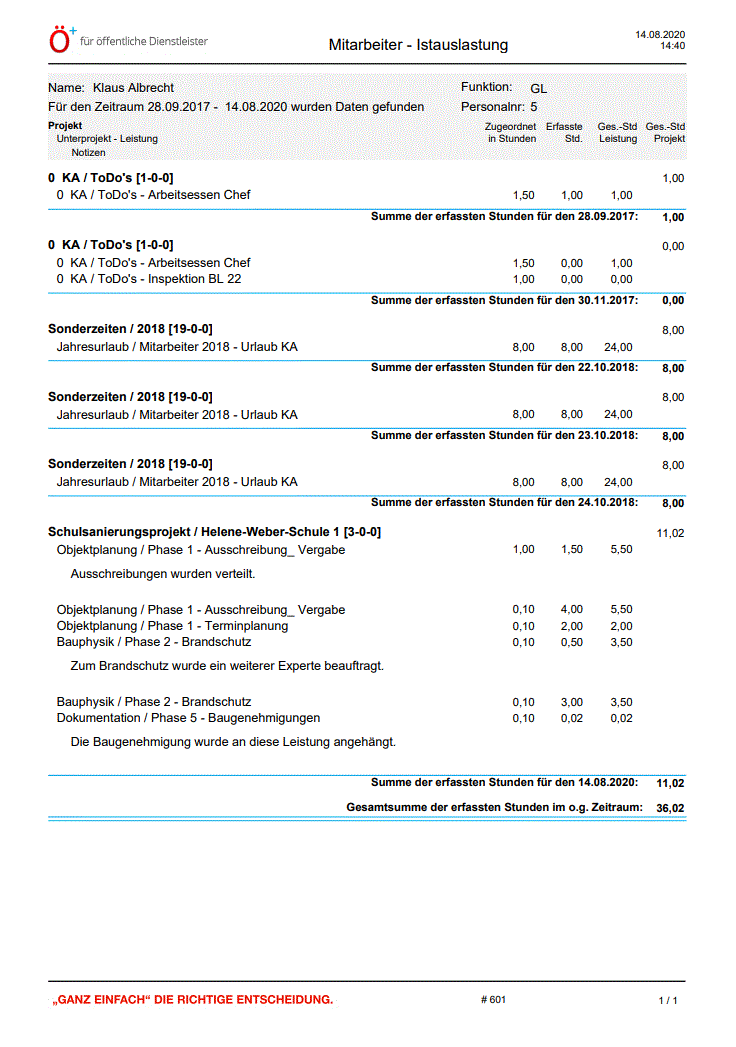 Mitarbeiter Monatsansicht (A7450) Der Bericht Mitarbeiter Monatsansicht (A7450) stellt tabellarisch die Anzahl an Arbeitsstunden eines Mitarbeiters für einen Monat je Projekt/ Leistung dar. Zusätzlich werden geleistete Über- oder Minderstunden des Mitarbeiters ausgewiesen. |