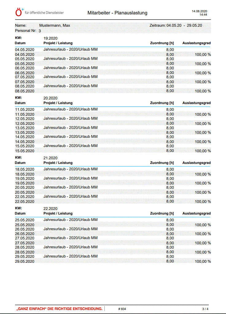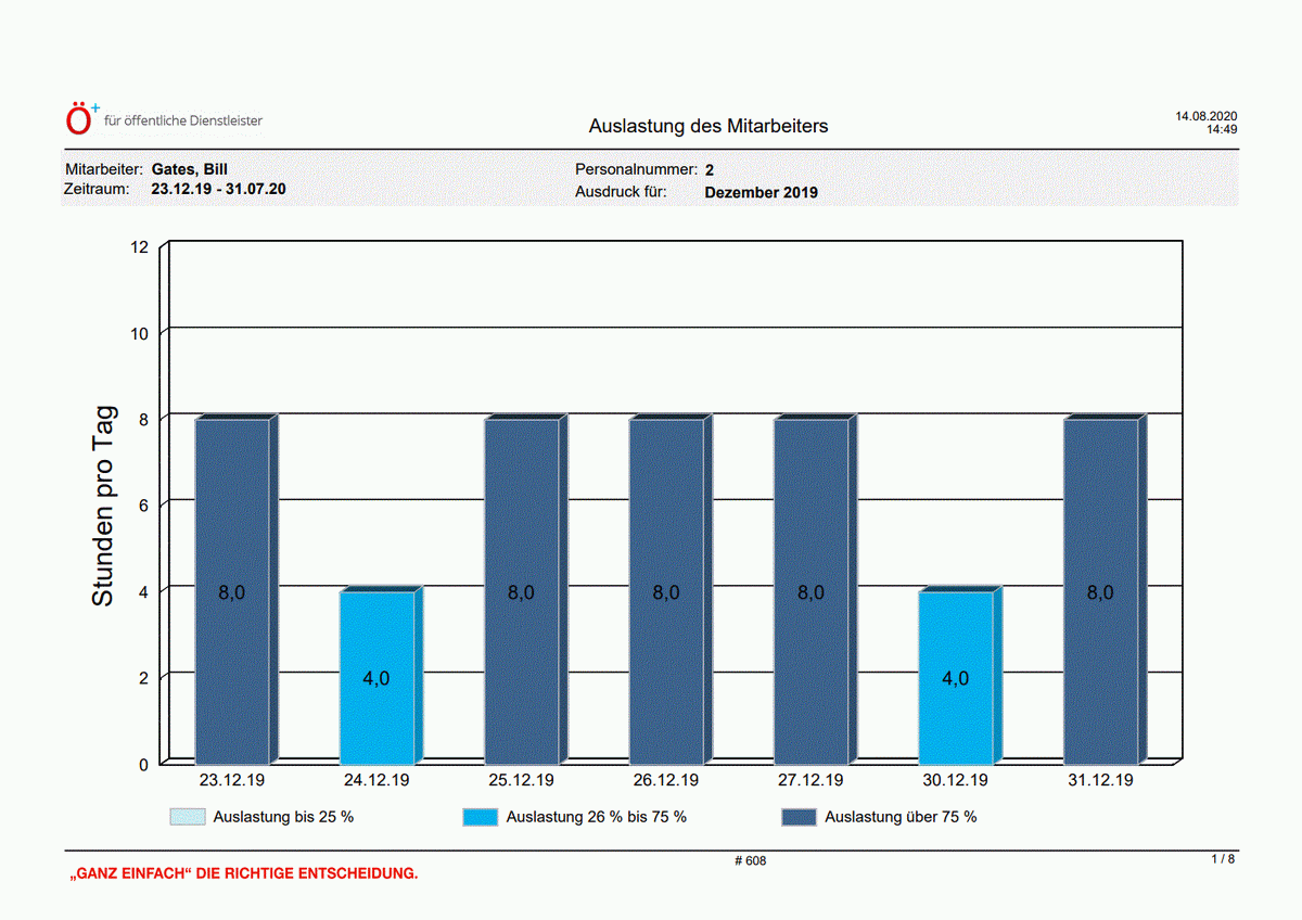 Mitarbeiterauslastung Balkenplan (A6080) In dem Bericht Mitarbeiterauslastung Balkenplan (A608) bereitet Ö+ die Auslastung eines Mitarbeiters grafisch auf. Es lassen sich Auslastungen von bis zu 5 Tagen miteinander vergleichen. |