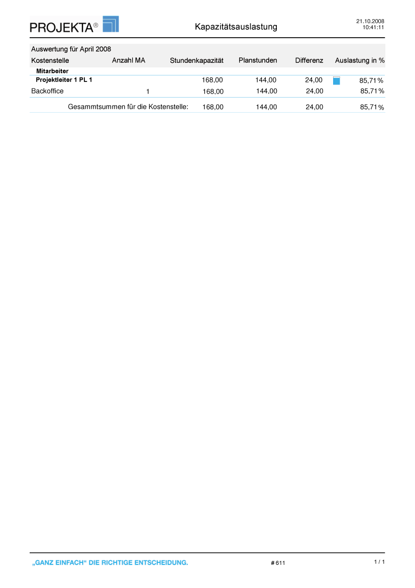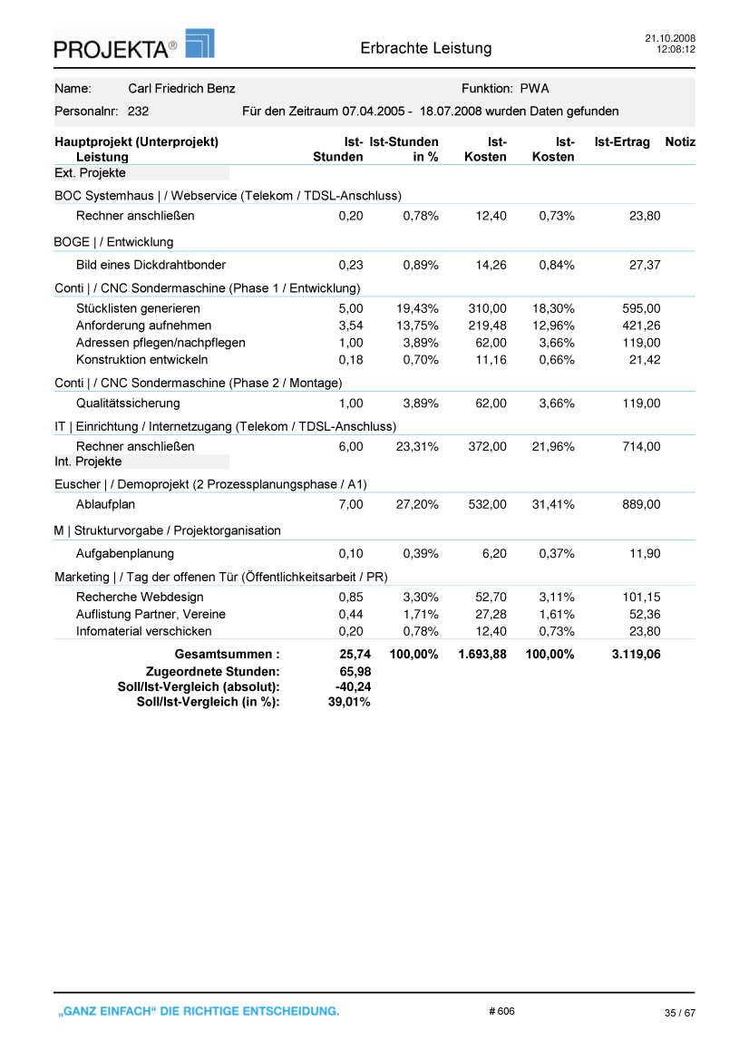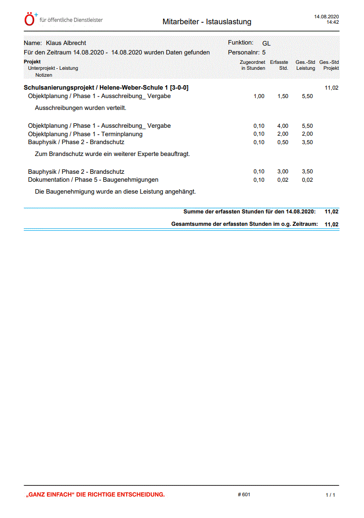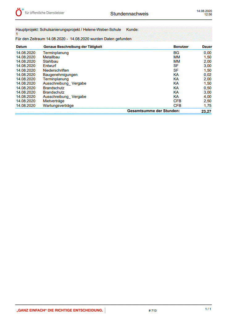 Mit dem Stundennachweis (A7130) wird aufgeschlüsselt, wie lange eine Ressource eine Aufgabe bearbeitet hat. |