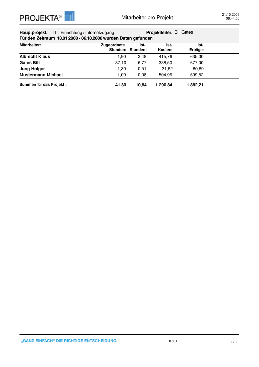 Mitarbeiter pro Projekt (A5010) Der Bericht Mitarbeiter pro Projekt (A5010) stellt tabellarisch die Ressourcen eines Projektes für einen bestimmten Zeitraum als Ist-Aufstellung dar. Zusätzlich werden die Gesamtsummen ausgewiesen. |