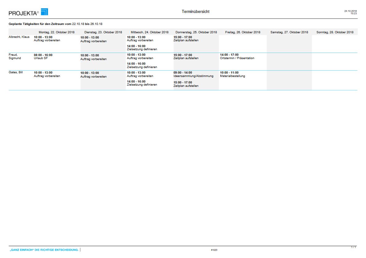 Der Bericht Terminübersicht Woche (A6200) zeigt die Termine aller Ressourcen für eine Woche in tabellarischer Form. |