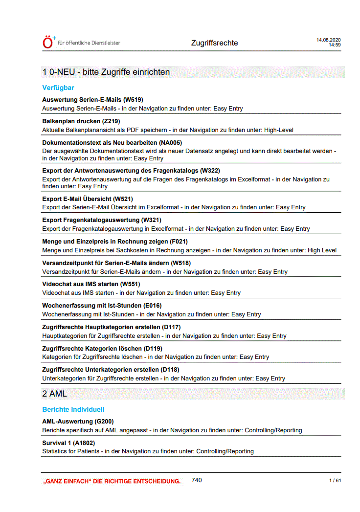 Verfügbare Zugriffsrechte (A7400) Der statische Bericht Verfügbare Zugriffsrechte (A7400) sortiert alle verfügbaren Zugriffsrechte nach Kategorien, so dass die Einstellung des richtigen Zugriffsrechts noch einfacher wird. |