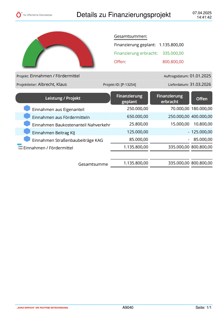 Details zu Finanzierungsprojekt (A9040) Der Bericht Details zu Finanzierungsprojekt (A9040) enthält eine Aufstellung von geplanten, erbrachten und offenen Finanzierungen eines Projektes. Dies erhalten Sie in einer grafischen Darstellung. Dabei wird jedes Projekt unterteilt in Unterprojekte und Leistungen dargestellt. Zu jeder Leistung sind einzelne Werte und zu Unterprojekten Zwischensummen sowie zu Hauptprojekten die Gesamtsummen einsehbar. Folgende Werte werden angegeben: