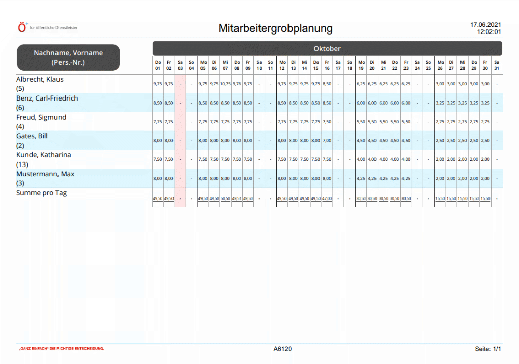 Rechts ist zu jedem Datum der zugehörige Wochentag zu erkennen. Bei den rot gefärbten Spalten handelt es sich um Feiertage. Neben der täglichen Auslastung jeder ausgewählten Ressource befindet sich ganz unten in der letzten Zeile die Summe jedes Tages. Jede Woche ist durch eine senkrechte Linie getrennt. |